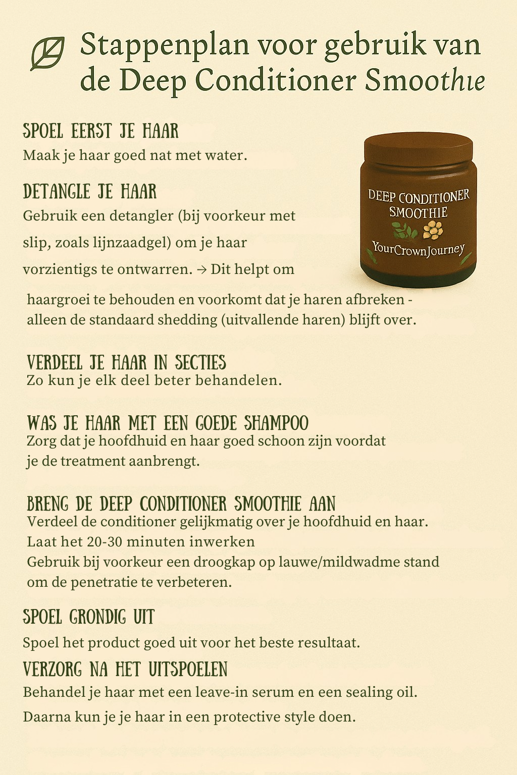 De Deep Conditioner Smoothie is een uitwasbare treatment. Laat het 20–30 minuten inwerken ( ik adviseer het gebruik van een droogcap op lauwe stand voor diepere penetratie) en spoel daarna grondig uit voor het beste resultaat. Zorg wel ervoor dat je na het uitspoelen je haar behandeld met een leave-in serum en sealing oil.